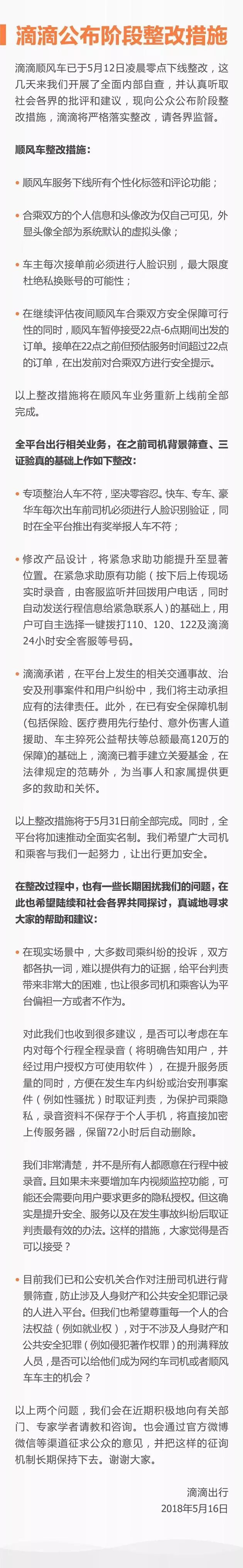关于顺风车业务具体上线时间,滴滴相关负责人回应媒体称,“目前仍在整改期,会视整改效果决定。” ▌滴滴究竟做错了什么? 今年2月以来,作为平台方的滴滴就一直处于风口浪尖。 2月,央视对滴滴快车司机为赚奖励,“甩单、拒单”以及“诱导乘客取消订单”等现象给予了报道。报道称,导致乘客不仅难以顺利出行,还不经意间降低了在滴滴平台的信用评级,影响日后的网约车出行。 3月,有网友在微博爆料称“滴滴利用大数据杀熟”,不同系统、不同级别的用户,在使用滴滴软件叫车时,会出现路程相同却存在价格差异的情况。“以前没有,以后也永远不会有。”随后,滴滴CTO张博在滴滴内网撰写了文章直接否认这一说法。 4月,滴滴女乘客疑似遭性骚扰事件,该乘客在公众号文章《滴滴,今天我想和你谈一谈》提到,她于3月30日晚上从中关村打车回酒店,期间遭遇滴滴优享车司机的语言骚扰。媒体介入后,女乘客晒出滴滴方面的回复是:行车记录仪被覆盖,暂时无法查看当天视频,需要时间去恢复。 4月底,疯蜜创始人张桓发文称被滴滴司机殴打,对此滴滴做出回应,称工作人员已第一时间跟进处置,调查核实冲突详情,联系乘客代表公司致歉。同时,滴滴为被打者垫付全部医疗费用,同时全力配合警方调查处理。 不过,数起事件均未引发滴滴对平台本身的整改。 5月5日晚上,一名21岁的空姐在郑州使用滴滴顺风车时遇害。5月12日,嫌疑人的尸体被警方打捞出来。 从此刻起,“整改”才正式成为摆在滴滴案头上的首要工作。 中国政法大学刑事司法学院卫婷写道: